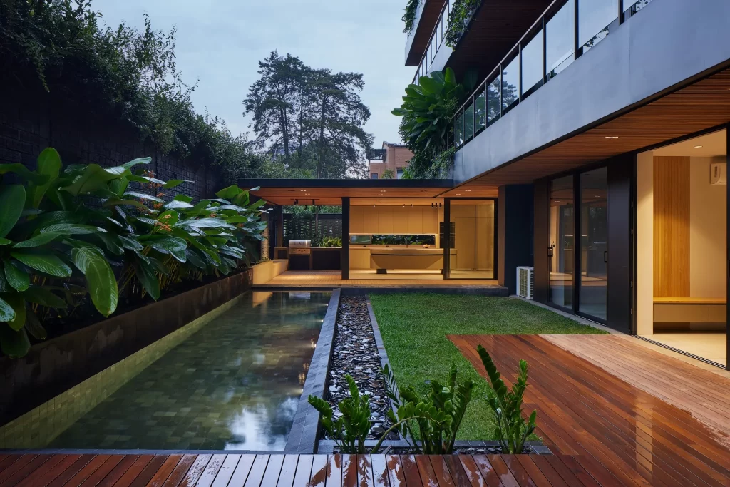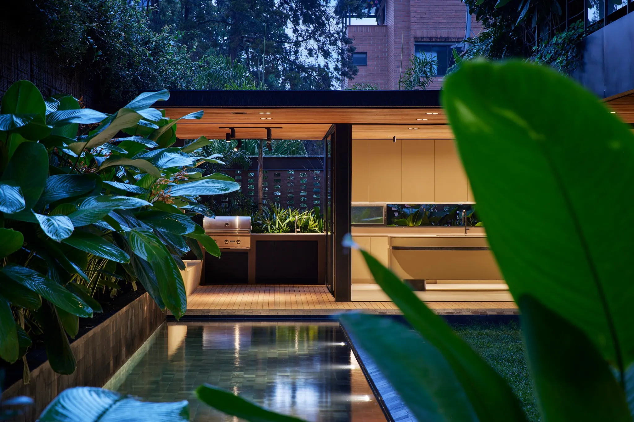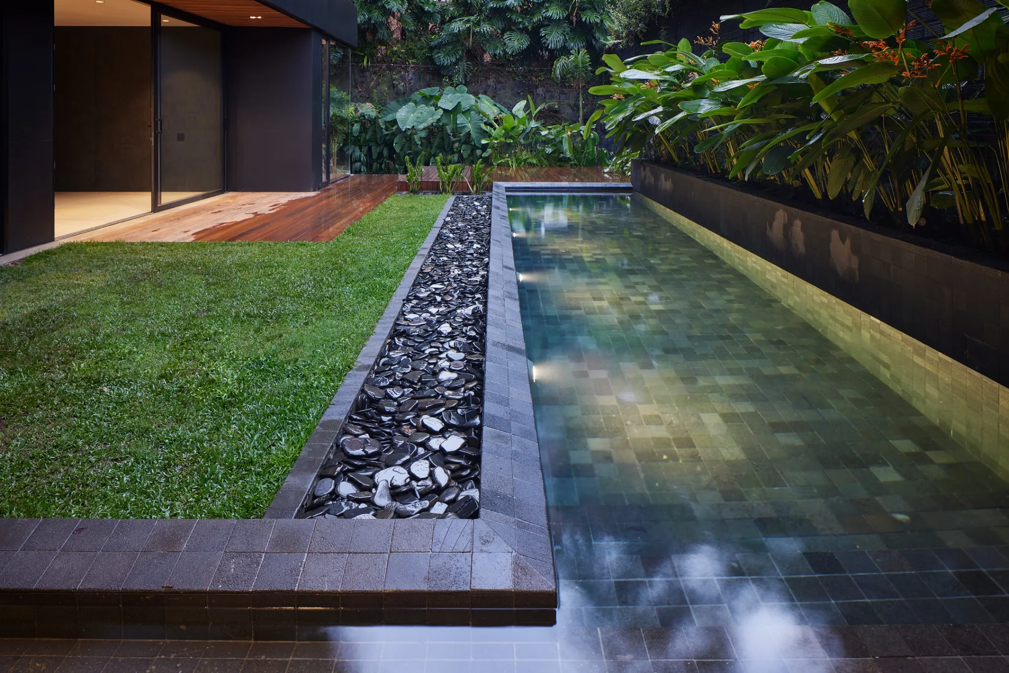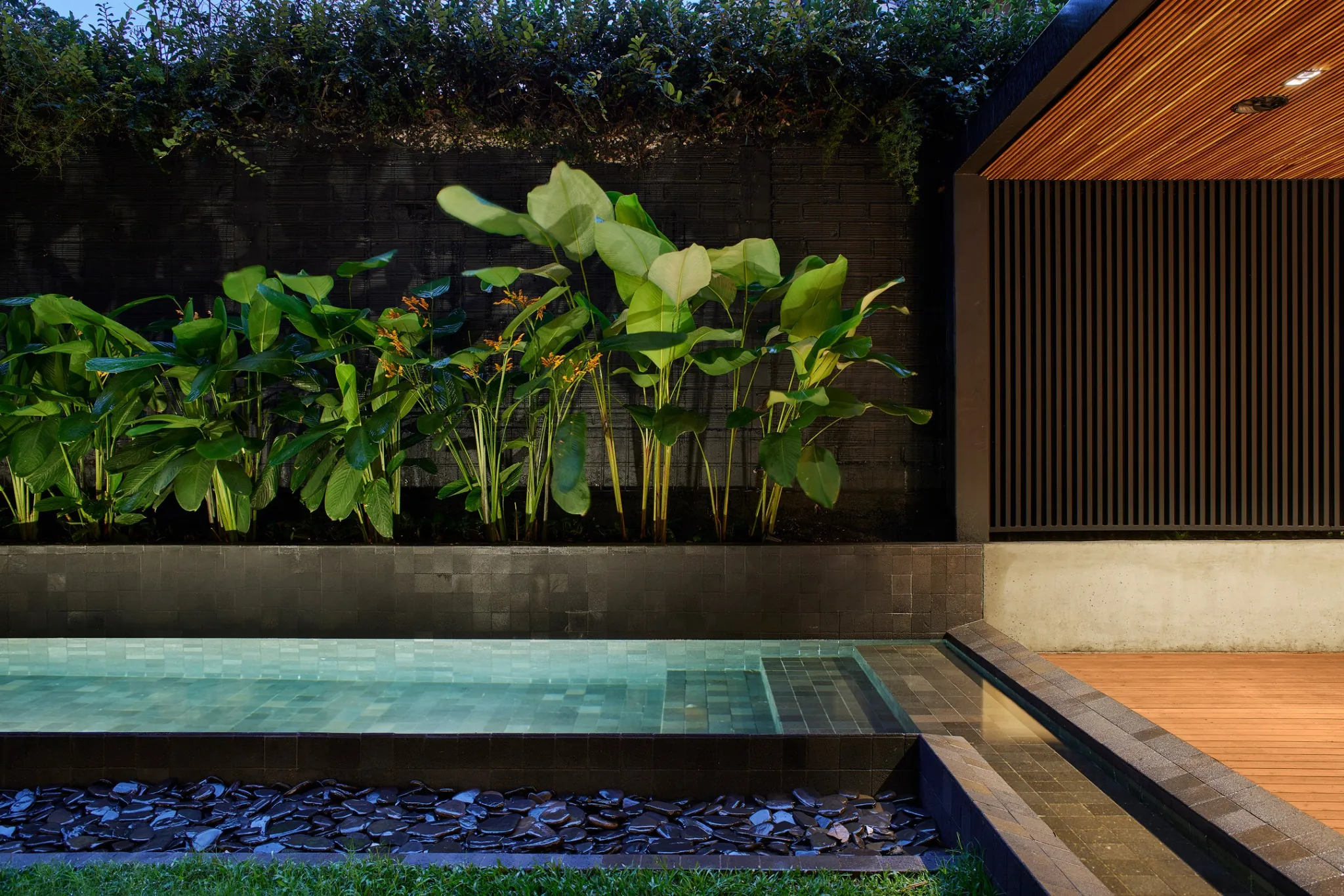 Piscina enchapada en piedra Lava Stone, un material que realza el tono verde selvático del agua y crea una atmósfera íntima y sofisticada. El enchape aporta textura, profundidad y una sensación natural que se complementa perfectamente con el jardín tropical y la arquitectura cálida del proyecto.