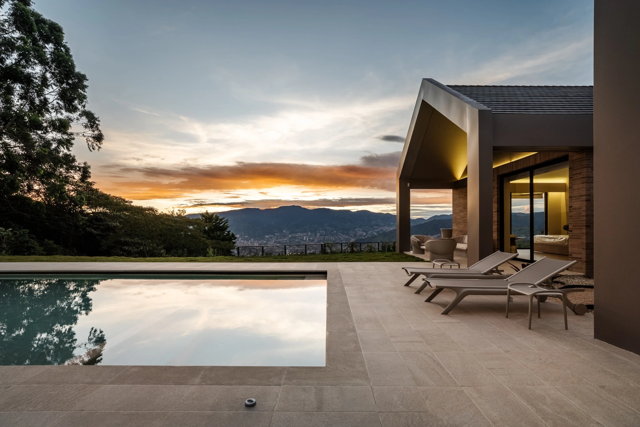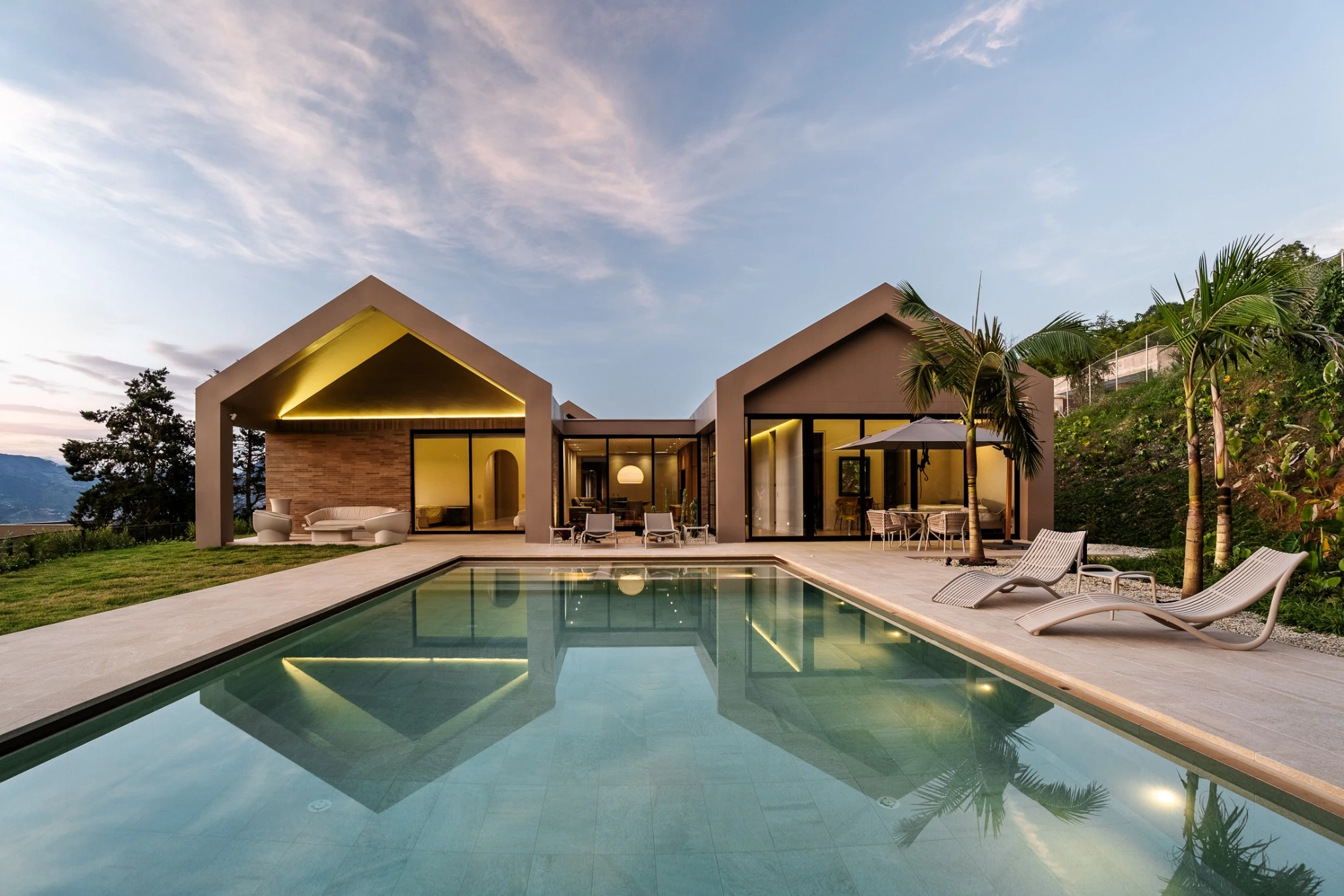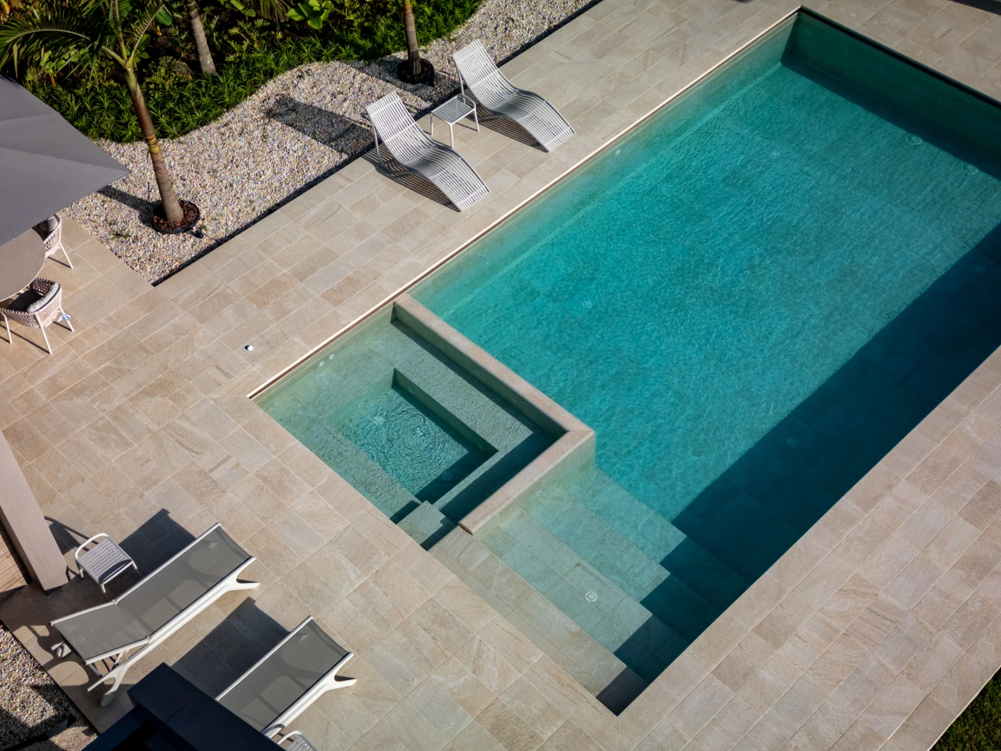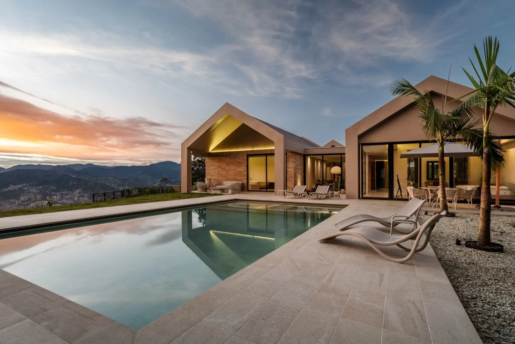 Piscina desbordante con sistema Smart y piezas especiales, donde el tono arena del revestimiento convierte el agua en un turquesa cristalino y sereno. Un espacio para contemplar el paisaje, respirar profundo y disfrutar la calma en las alturas.