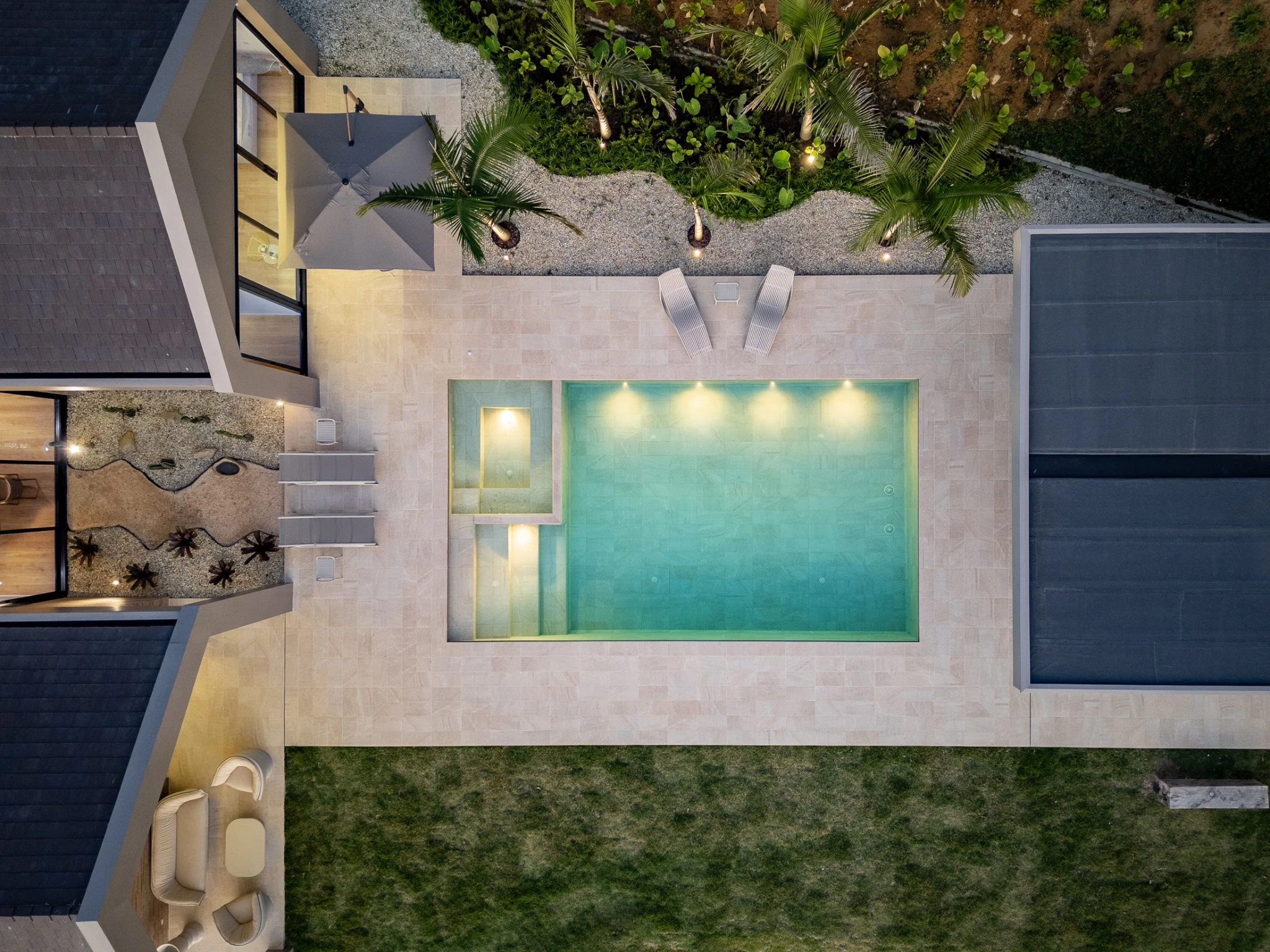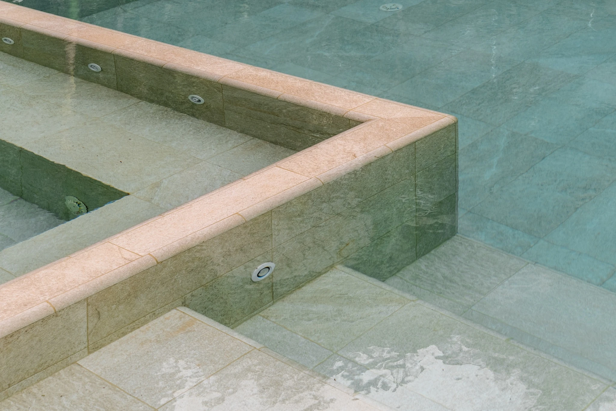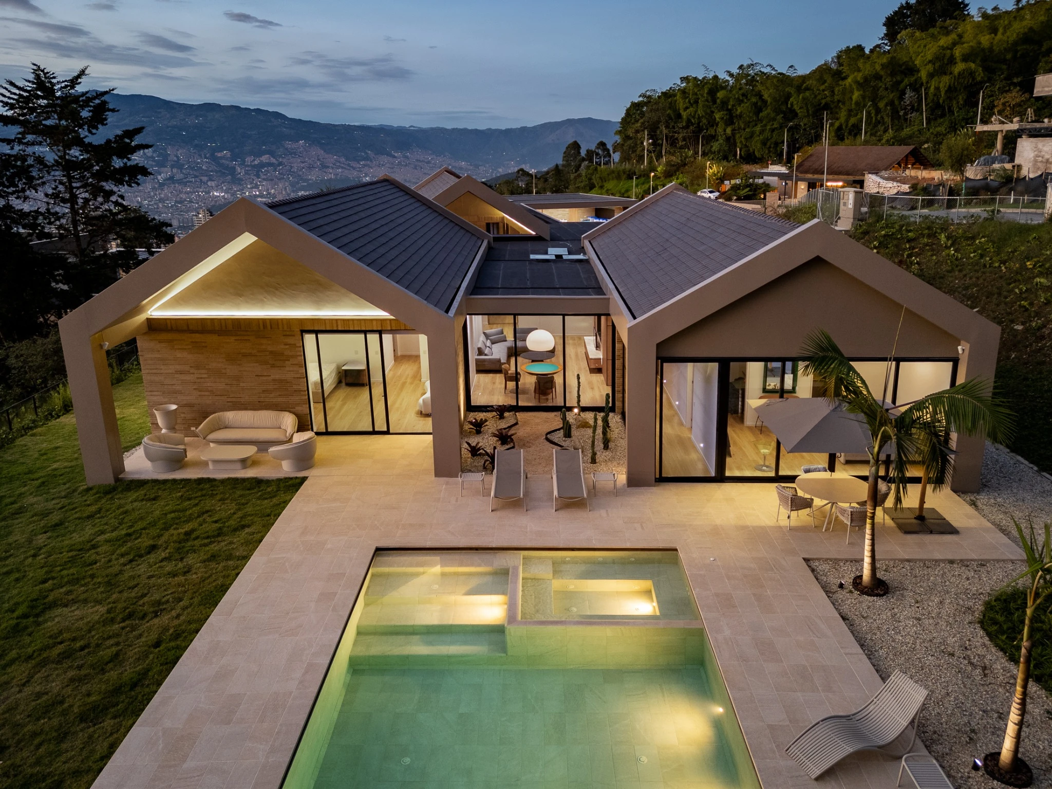 Piscina desbordante con sistema Smart y piezas especiales, donde el tono arena del revestimiento convierte el agua en un turquesa cristalino y sereno. Un espacio para contemplar el paisaje, respirar profundo y disfrutar la calma en las alturas.