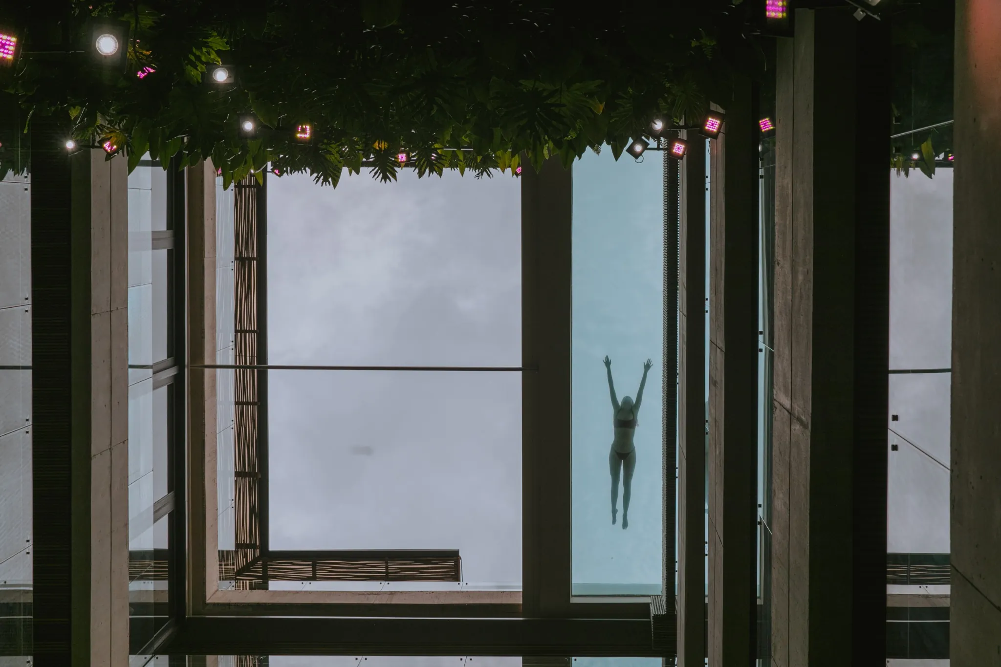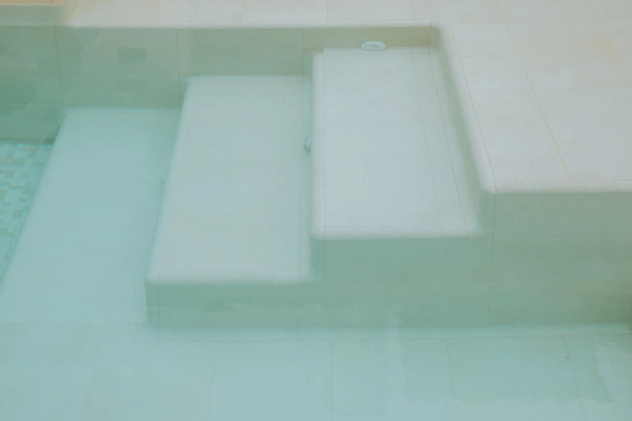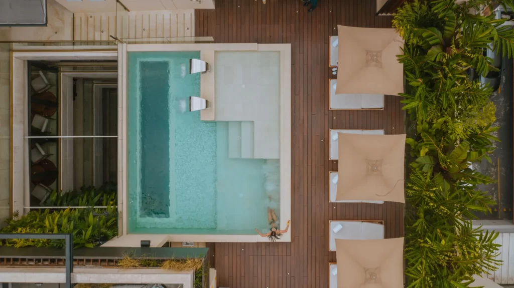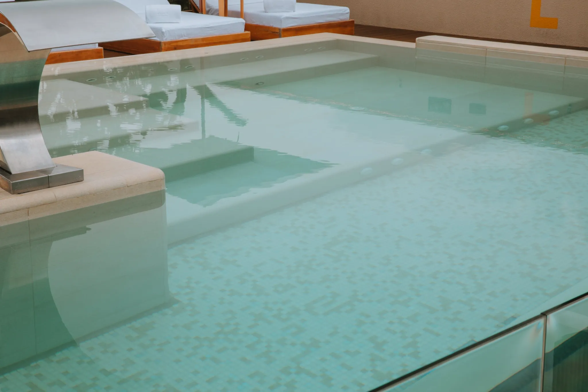 Piscina tipo cubo flotado con porcelanato Mistery White en playa, escalas y piezas especiales, combinada con mosaico vítreo Argo en el fondo. Incluye un vidrio templado inferior que realza el diseño y pertenece a la terraza del Hotel El Cielo.