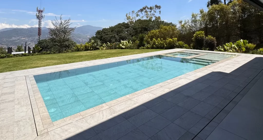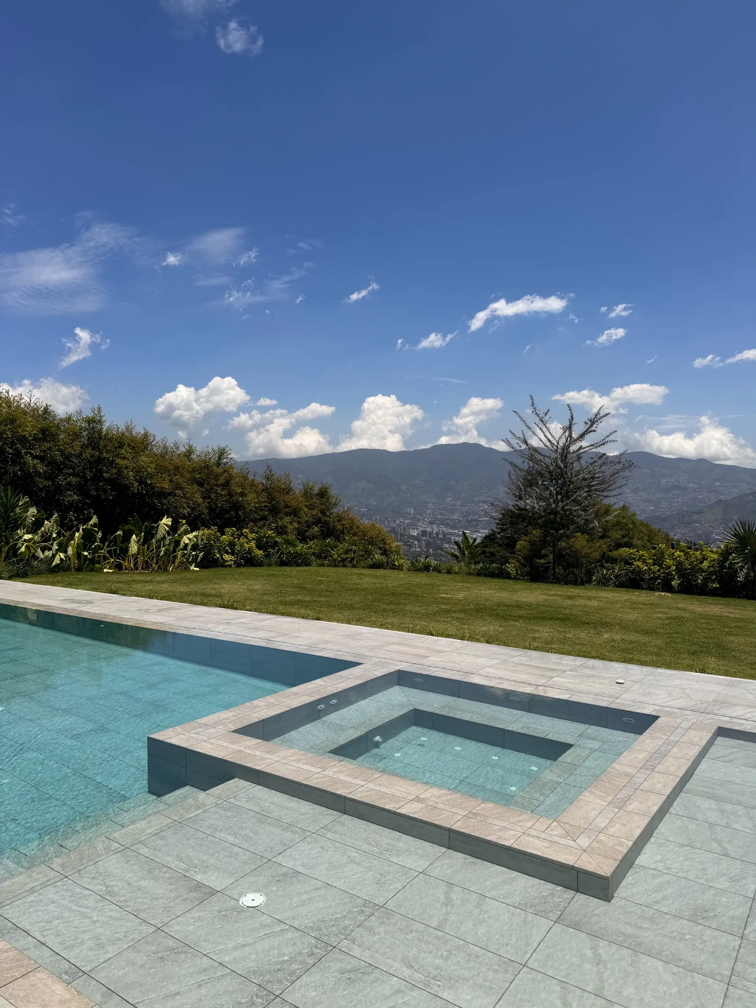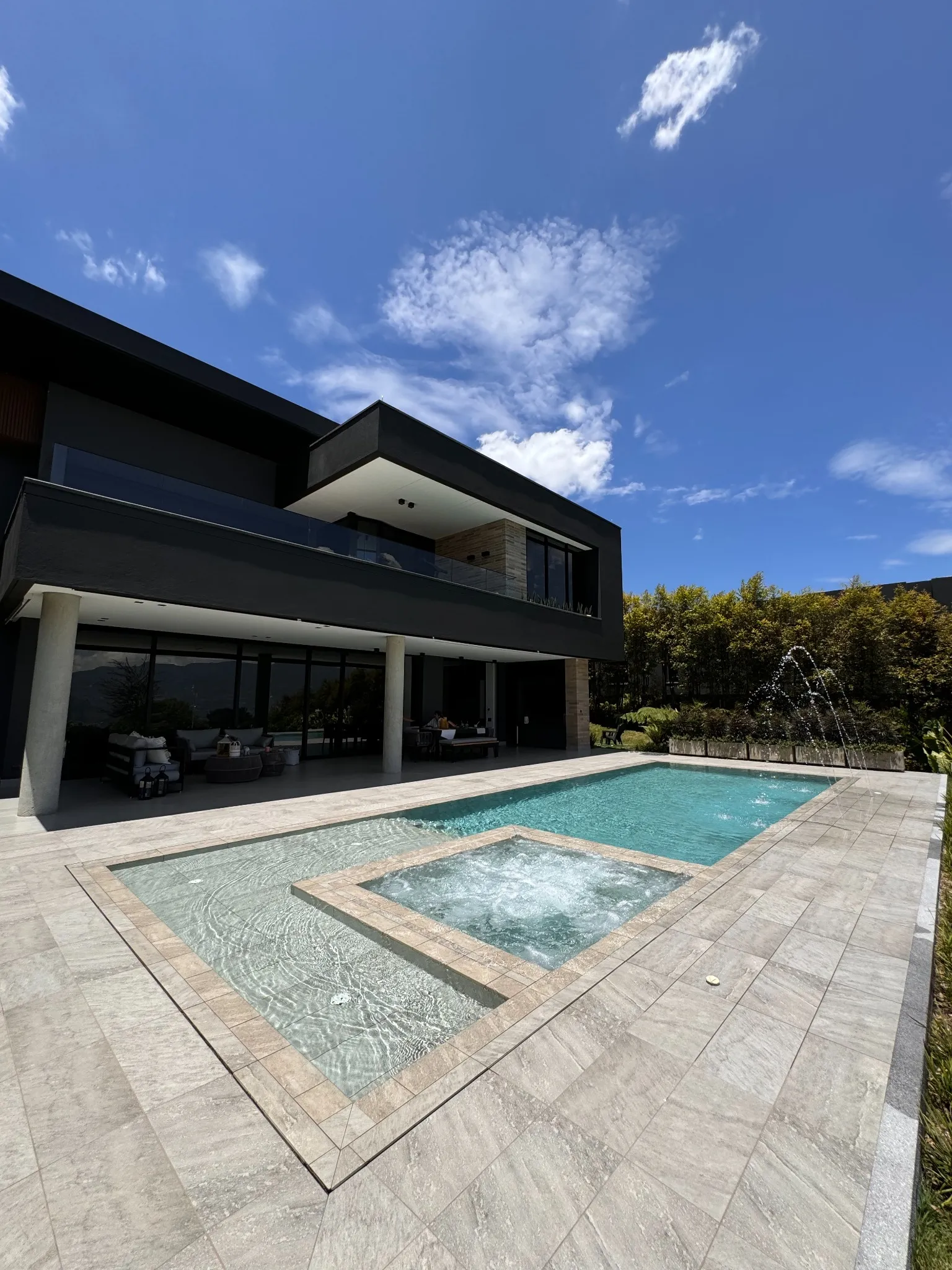 Piscina desbordante con spa subacuático, diseñada con una terraza que utiliza el mismo material en tono gris, creando continuidad visual y una estética armoniosa. En el interior logra un agua azul cielo, clara y luminosa, que realza la tranquilidad del espacio.