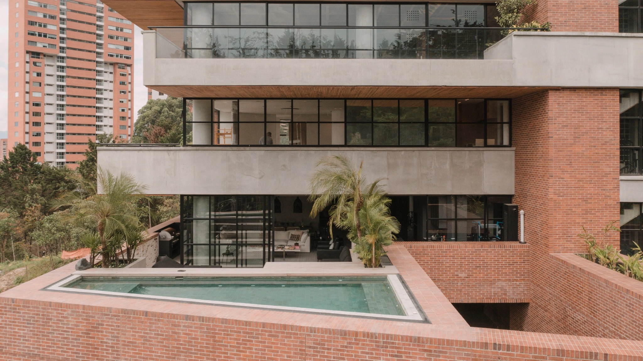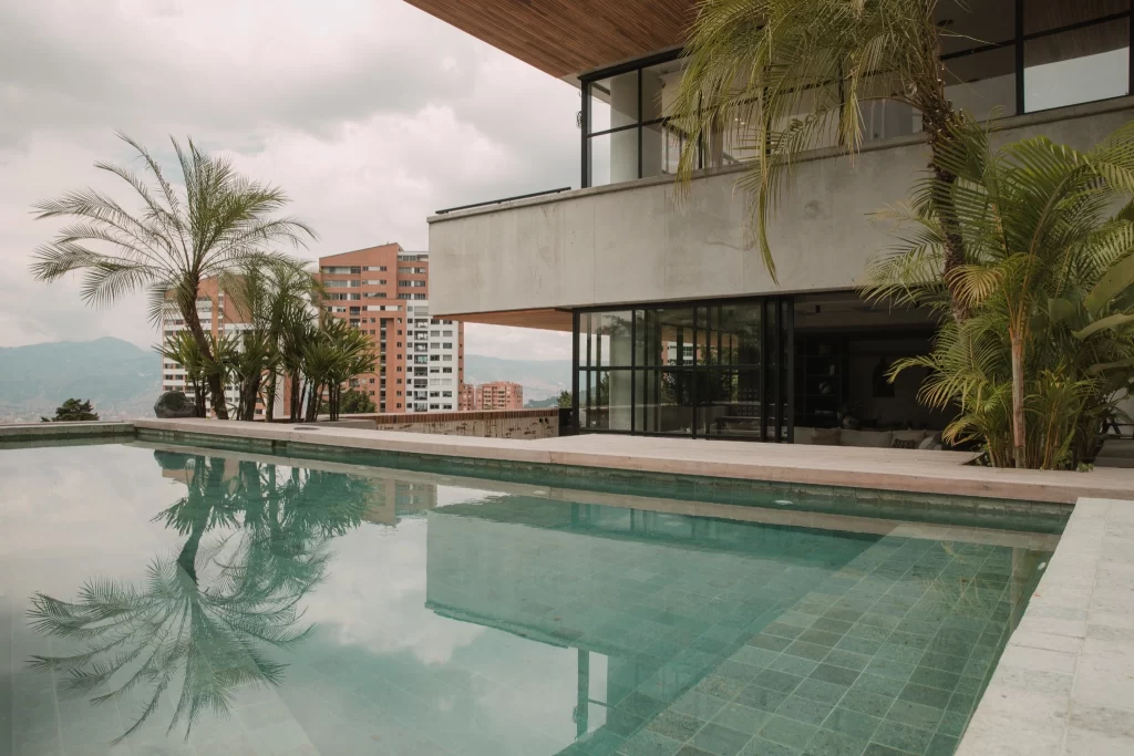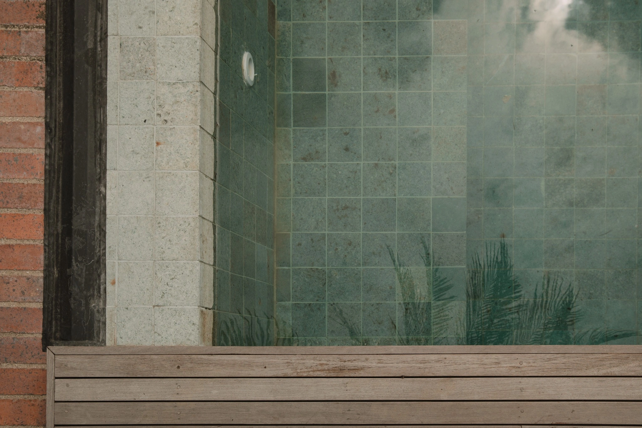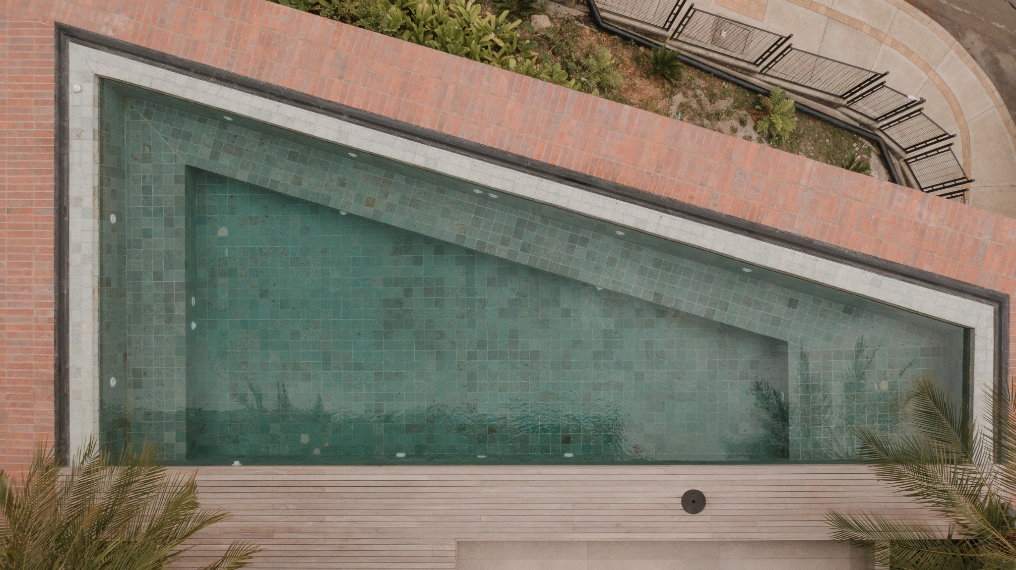Spa enchapado en piedra Bali, con tonos verde agua que generan un efecto natural y orgánico. El formato irregular de la piedra aporta textura y profundidad, creando un contraste sutil con la arquitectura en ladrillo y concreto.