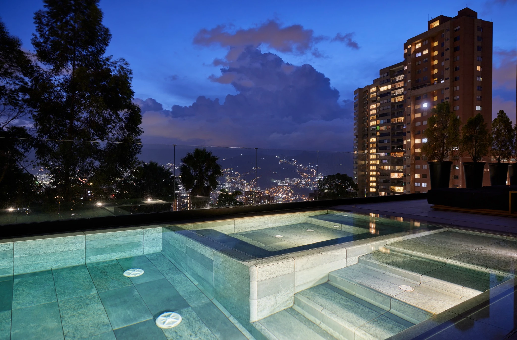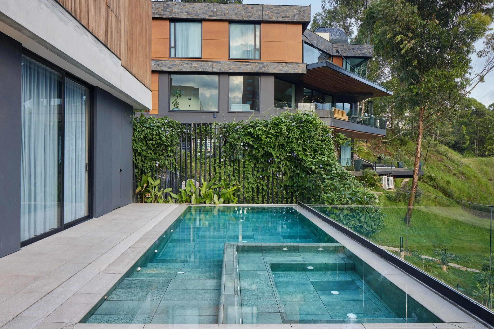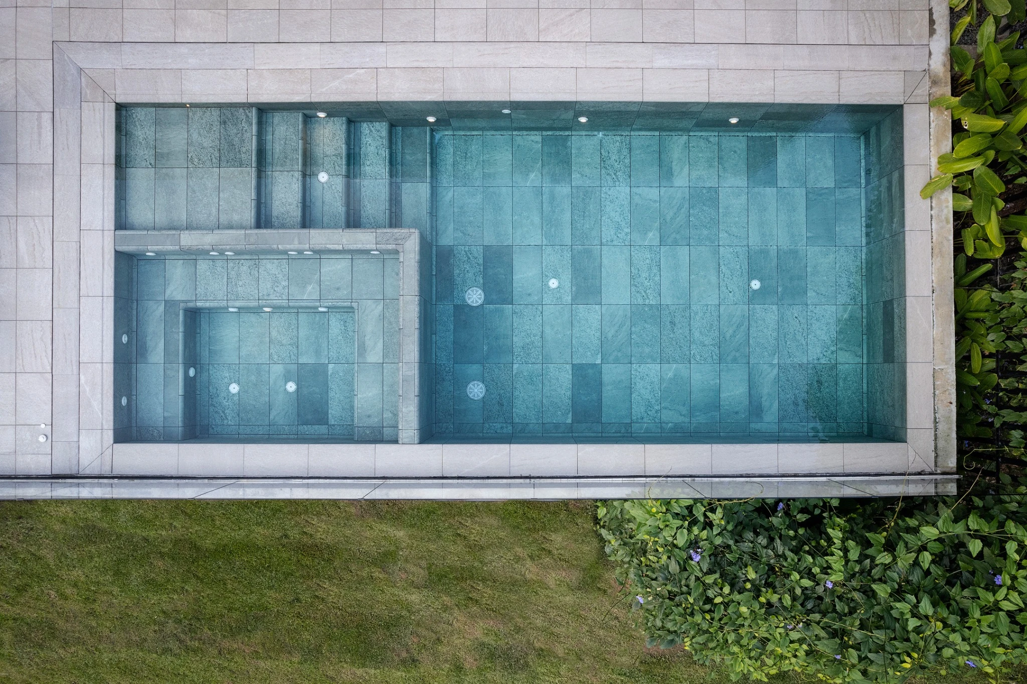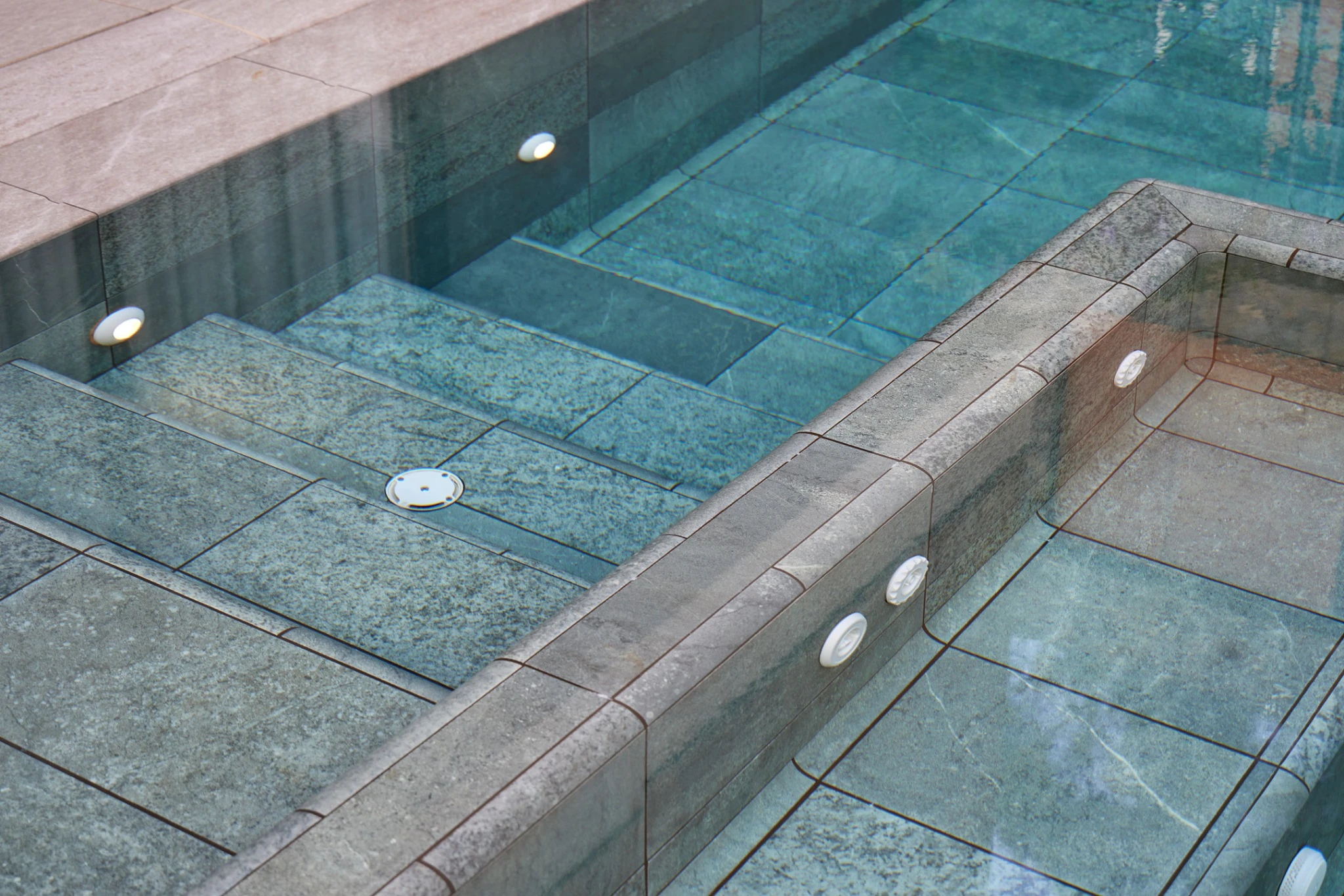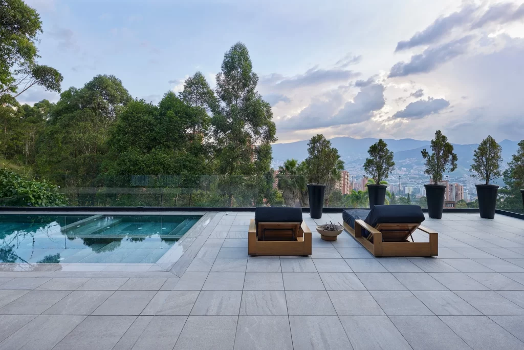 Piscina desbordante con spa en porcelanato Tresor Bali, que logra un agua verde-azulada muy limpia. Las piezas especiales suavizan esquinas y escalas, evitando bordes filudos. En el exterior, el Serena Griggio enmarca el diseño y resalta la vista hacia la ciudad.