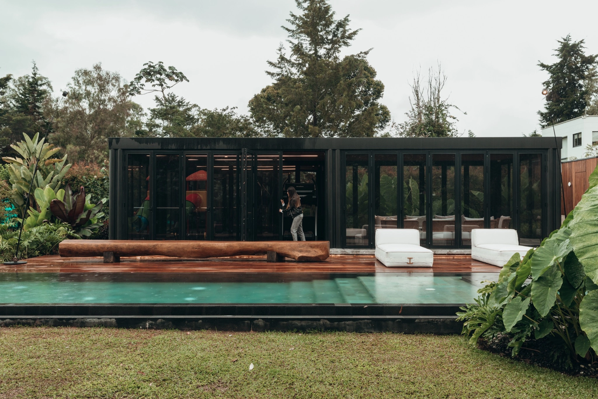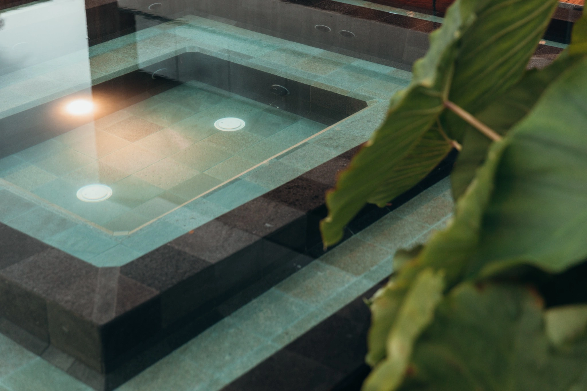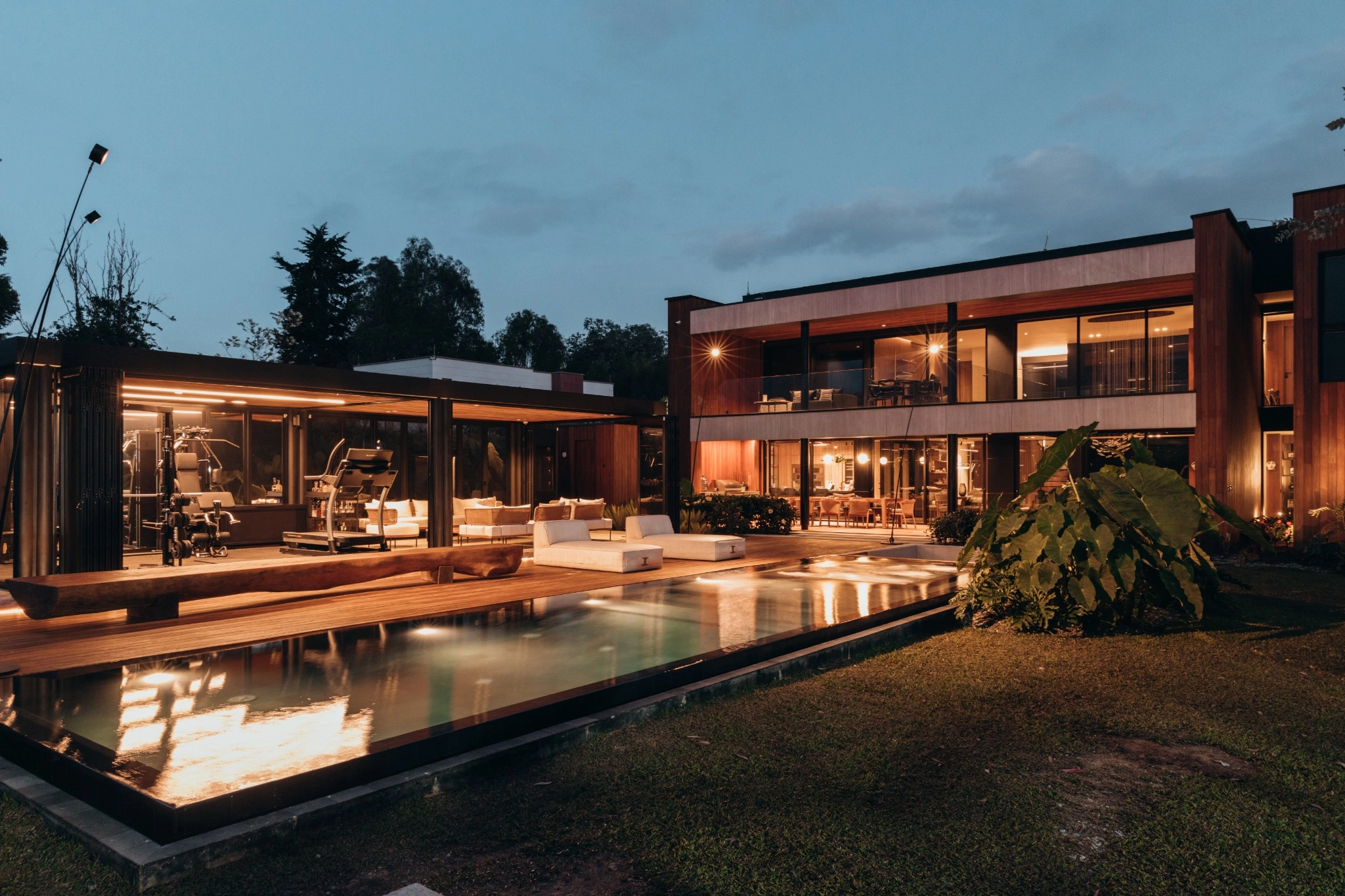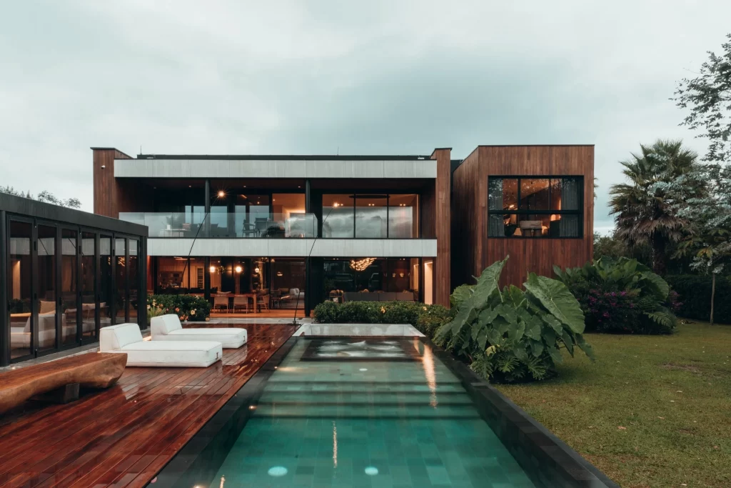 Piscina desbordante en piedra Bali verde y Lava Stone negra, una combinación que crea un contraste marcado entre el tono turquesa profundo del agua y el borde oscuro perimetral. La mezcla de texturas minerales refuerza la estética contemporánea del proyecto y dialoga con la arquitectura en madera y vidrio que la rodea.